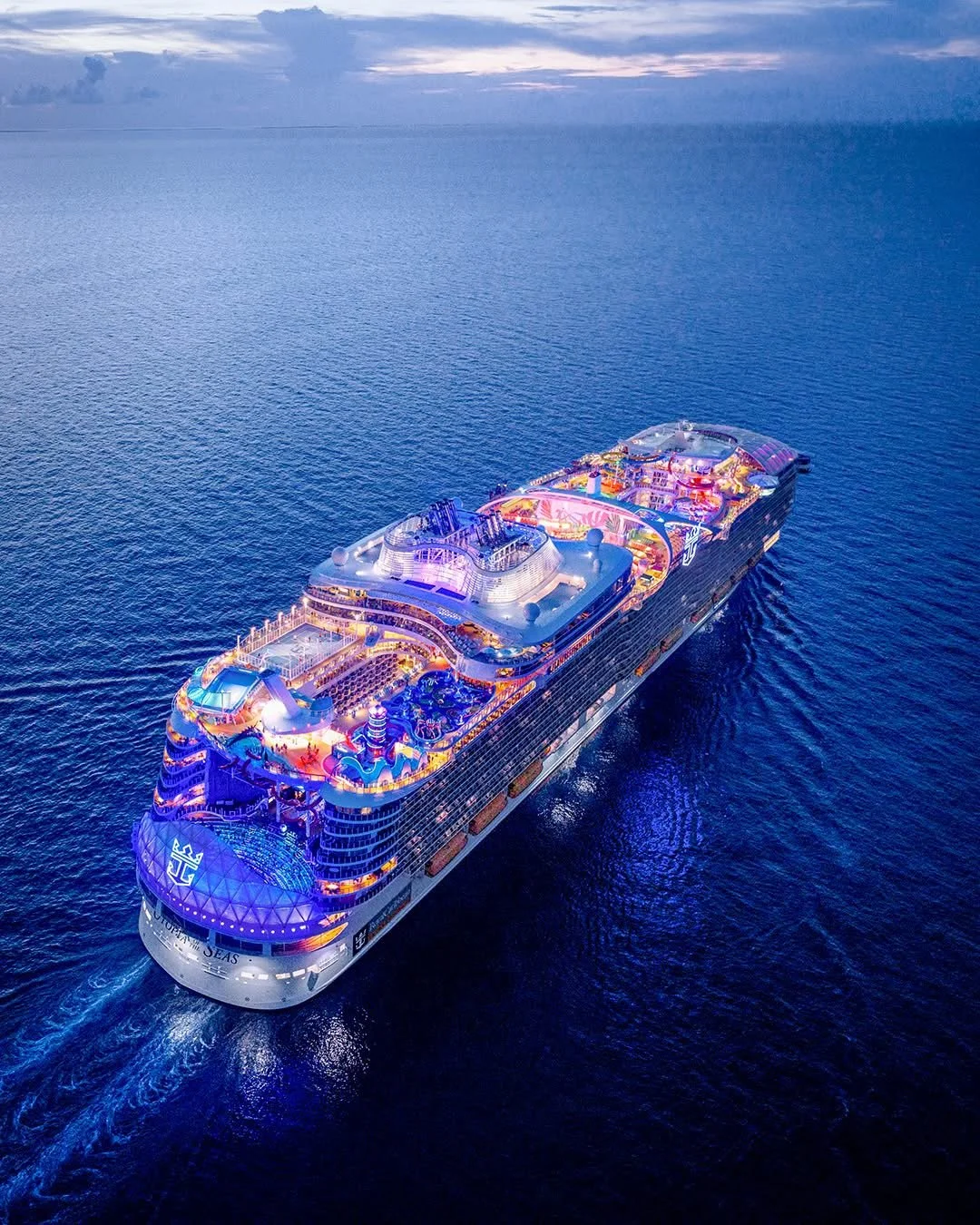 A large cruise ship named Wonder of the Seas sailing at sunset with colorful neon lights and a rainbow sky in the background.